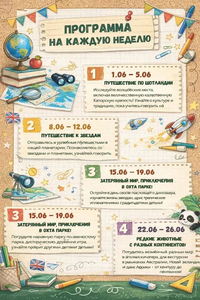 Ребят ждут тематические игры, творческие задания, обсуждения и активности на английском язык